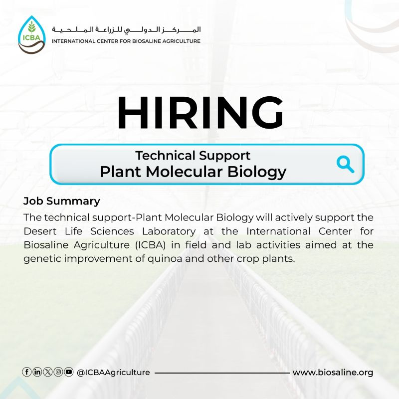 The technical support-Plant Molecular Biology will actively support the Desert Life Sciences Laboratory at the International Center for Biosaline Agriculture (ICBA) in field and lab activities aimed at the genetic improvement of quinoa and other crop plants.